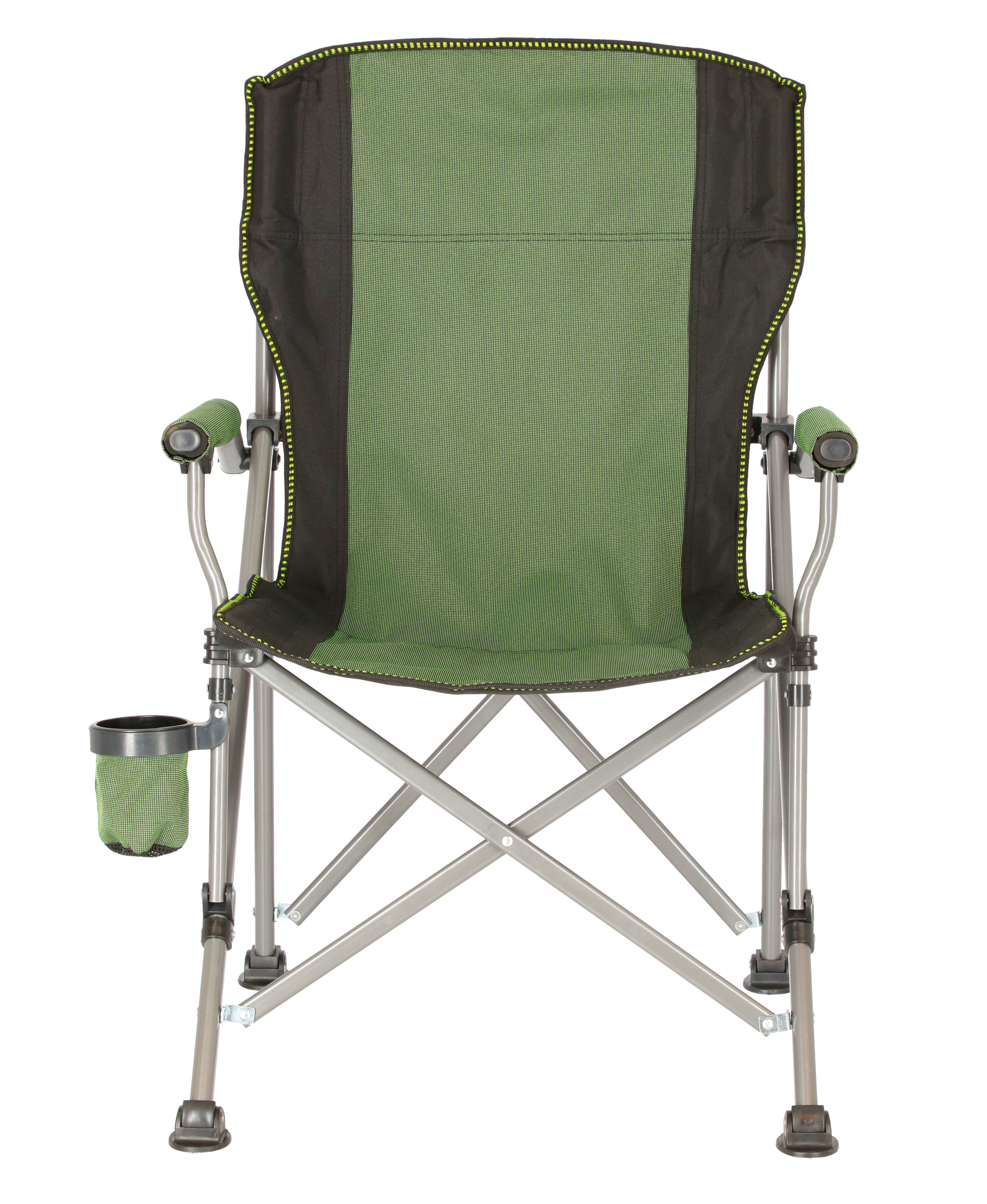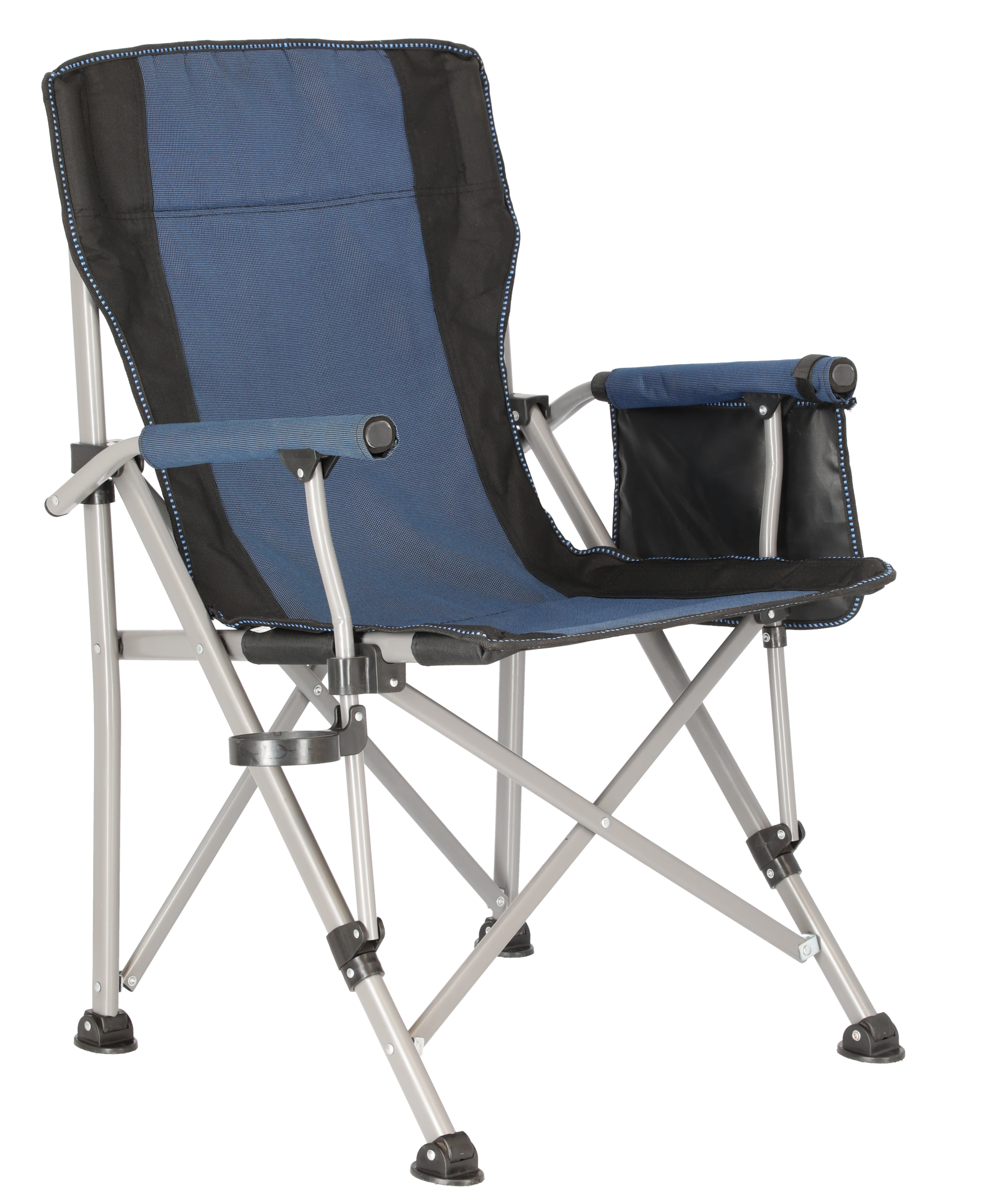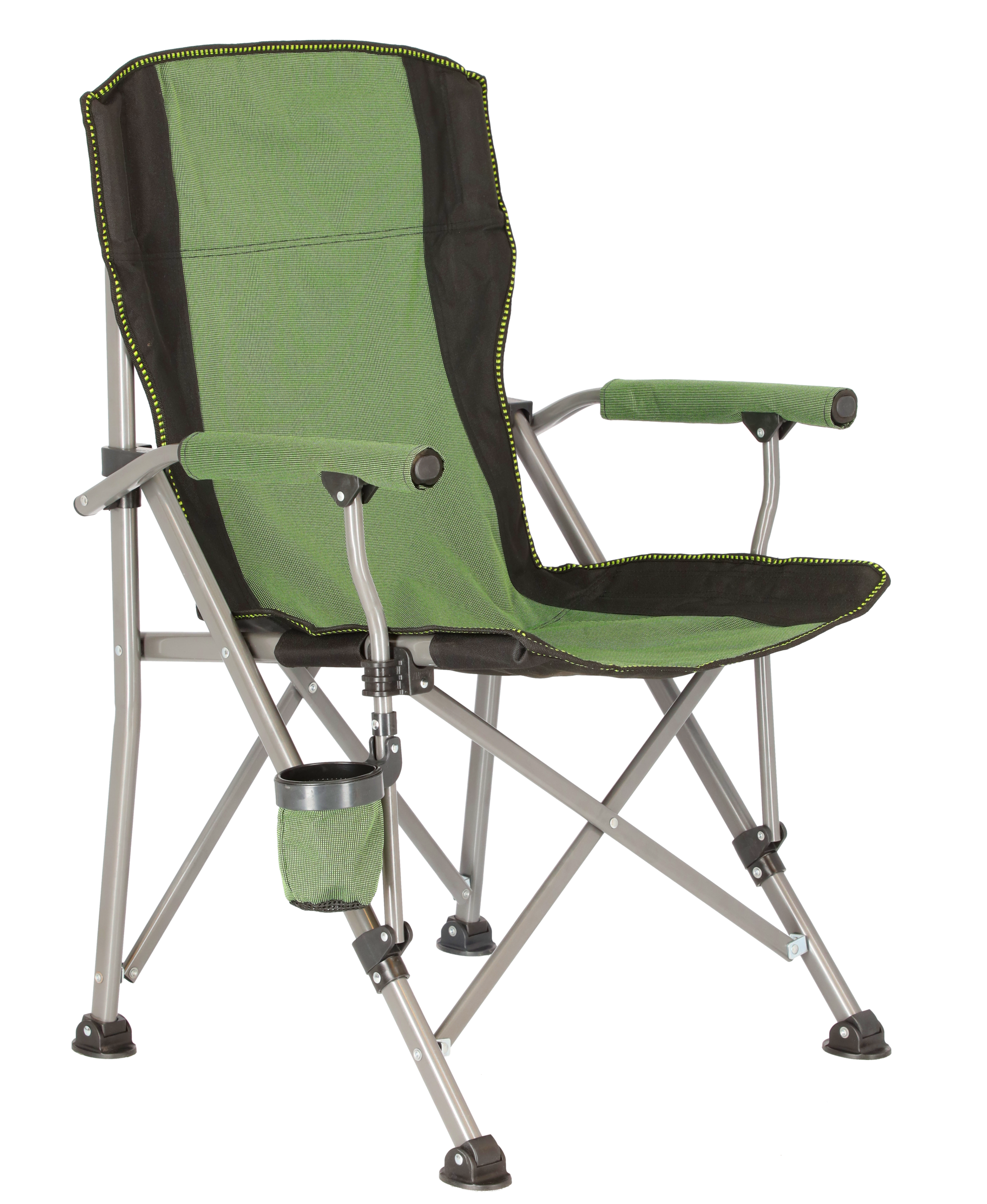 Comfortable camping chair. Made from light metal, adjustable and stable. Includes padded handles and a compartment for bottles.